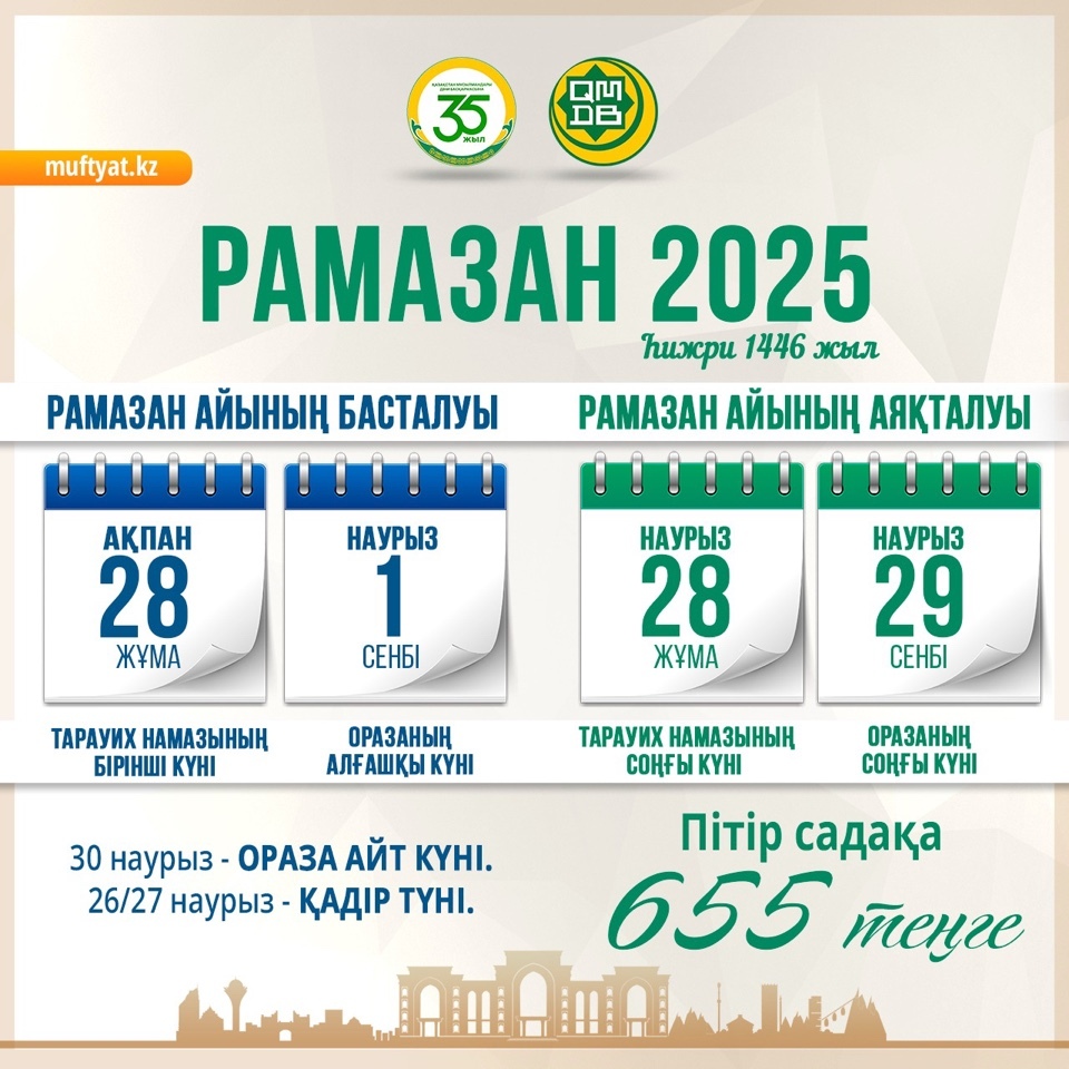 Ортақ пәтуаға сәйкес, қасиетті Рамазан айы 1 наурызда басталады. Ал наурыз айының 26-нан 27-не қараған түн – қасиетті Қадір түні. 30 наурыз – Ораза айт мерекесі. Қазақстан мұсылмандары діни басқармасының Төралқа мәжілісінде пітір садақасы еліміз бойынша екі келі ұнның орташа бағасы негізінде 655 теңге болып бекітілді.